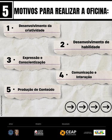 Confira 5 motivos pelo qual você deveria fazer a nossa oficina de revista. Arraste para o lado para saber mais.